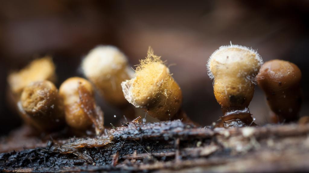 Diese Fruktifikation in der Bildmitte ist gereift, die Hülle aufgeplatzt und Sporen werden freigesetzt. Rechts davon ist der Schimmel wieder etwas schneller.
