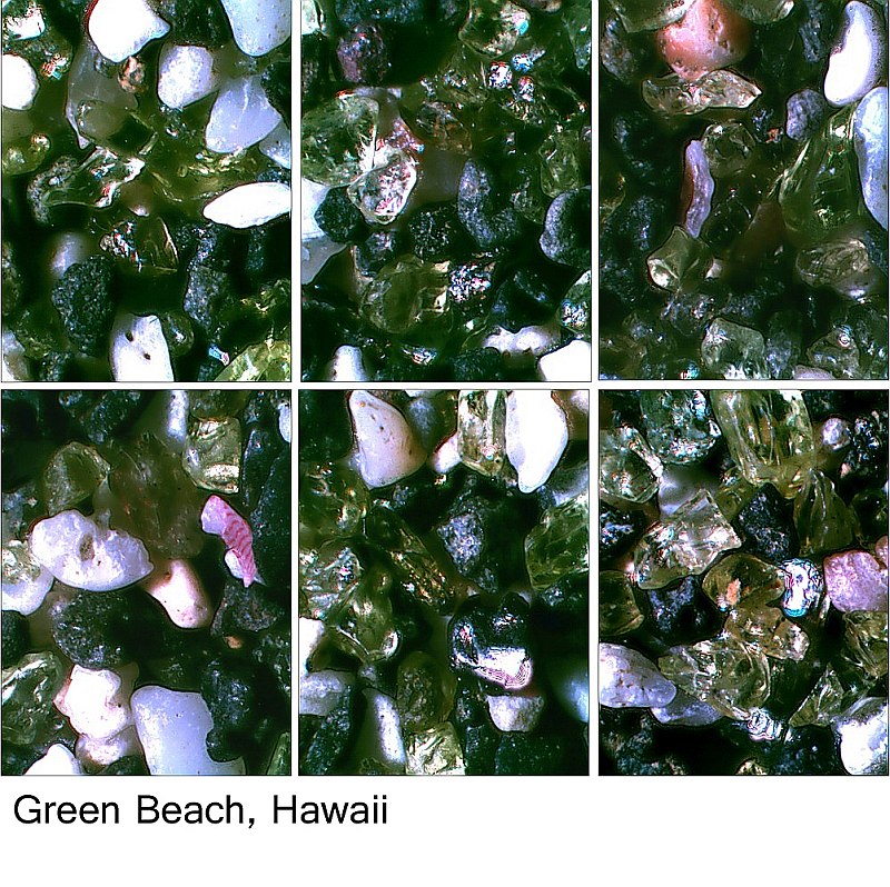 Mikroaufnahme des Sandes vom "Grünen Strand" auf Hawaii. Die grüne Farbe sind Körnchen des Edelsteins OLIVIN.