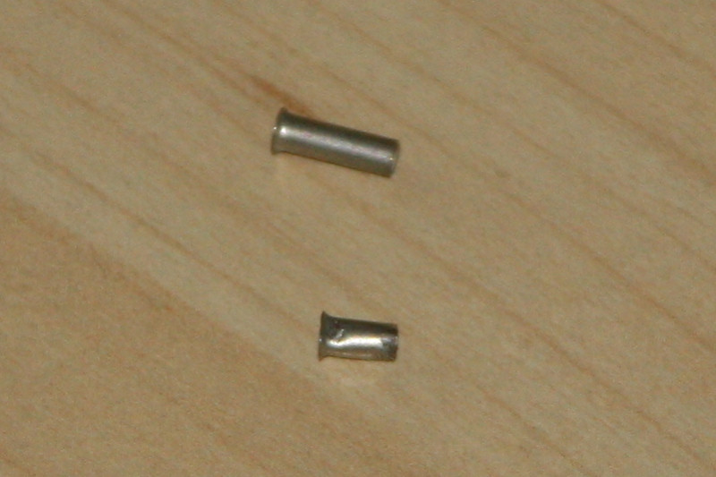 Im nächsten Bild sieht man nun eine solche Adernendhülse (im Hintergrund). Diese muß zunächst auf etwa 3mm gekürzt werden, das entspricht so etwa der Länge des Blendenstössels, der aus dem Objektiv ragt. Im Vordergrund des Bildes erkennt man eine gekürzte Endhülse.