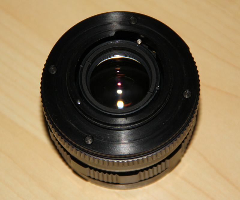 Einfach die 4 Schrauben lösen und die Objektivrückwand mit M42-Gewinde abheben, Vorsicht, dass der Blendenstift nicht ins Innere des Objektivs fällt (am besten festhalten) !