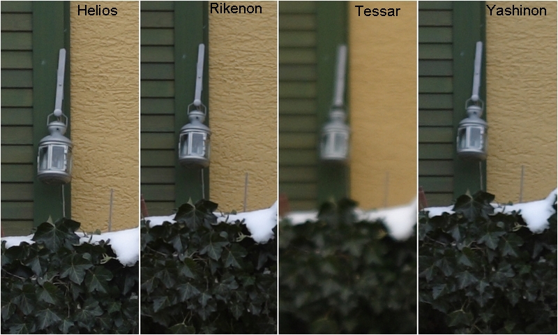 Wie schon erwartet (nicht wahr Henry) schneidet das Rikenon am besten ab. Im Zentrum unterscheiden sich das Rikenon und das Helios kaum, gefolgt vom Yashinon und erschreckend schwach das Tessar. Am linken oberen Rand ist wiederum das Rikenon der Winner, gefolgt allerdings vom Yashinon, hier schwächelt das Helios ziemlich und wiederum abgeschlagen das Tessar.
