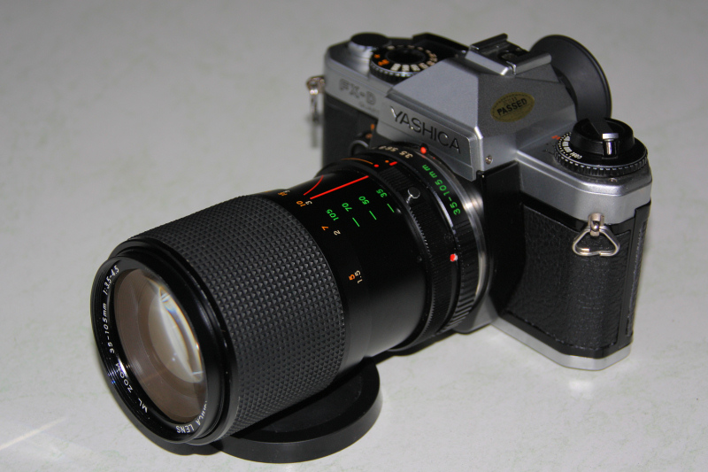 Das Yashica ML 3,5-4,5/35-105mm erhielt ich praktischerweise mit passendem Rückdeckel in Form einer abgewetzten Yashica FX-D. Nach einem kurzen Aufenthalt in Loeffels Beautyfarm erstrahlt die FX-D durch Austausch der maroden Lichtdichtungen und der Belederung in neuem Glanz und funktioniert wie am ersten Tag.
