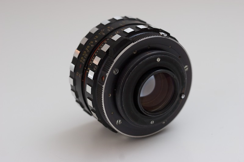 Das Schacht Travelon ist als Planar Doppel-Gauss mit sechs Linsen in vier Gruppen konstruiert, die gesamte Mechanik (M-A-Umschalter, Schärfetiefeanzeige) ist wertig und "unsparsam" aufgebaut, das Objektiv ist schwer und macht den Anspruch deutlich, Oberklasse sein zu wollen. Leider kollidiert die Rückkonstruktion mit dem Spiegel der EOS 5D.