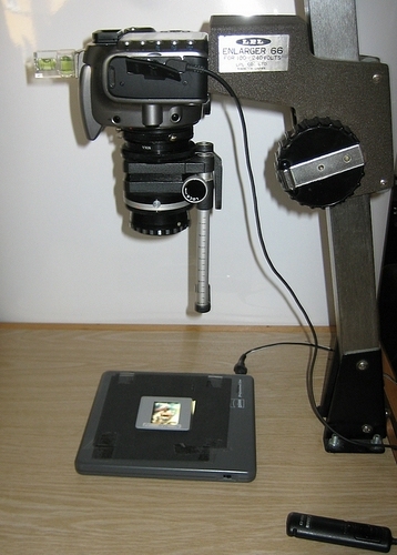 Zum Digitalisieren von Diapositiven lege ich das Dia auf ein kleines Weißlicht-Leuchtpult und fotografiere es im abgedunkelten Raum mit diesem Konstrukt ab.