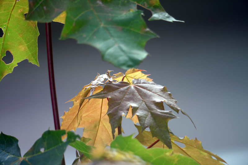 Hier nun Blätter im Gegenlicht in ca. 8 m Entfernung out of the cam. Leider war es windig heute, sodass es Geduld brauchte um einigermaßen scharfe Aufnahmen zu ergattern. Der Hintergrund ist ein Baumstamm etwa 5 m hinter den Blättern: