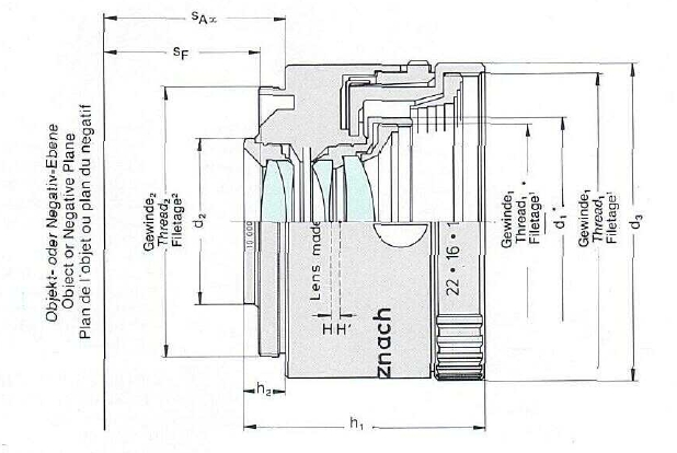 Vergrößerungsobjektiv für das Negativformat 9 x 12 cm, bestehend aus 4 Linsen in 3 Gliedern, Blende 4,5 bis 32 und Anschlußgewinde M39 x 0,75.