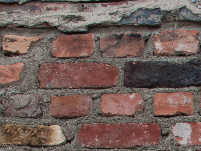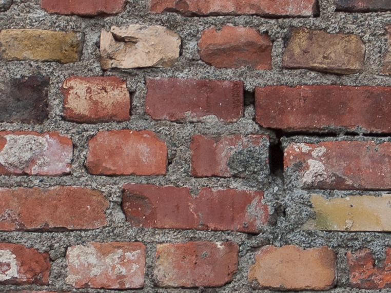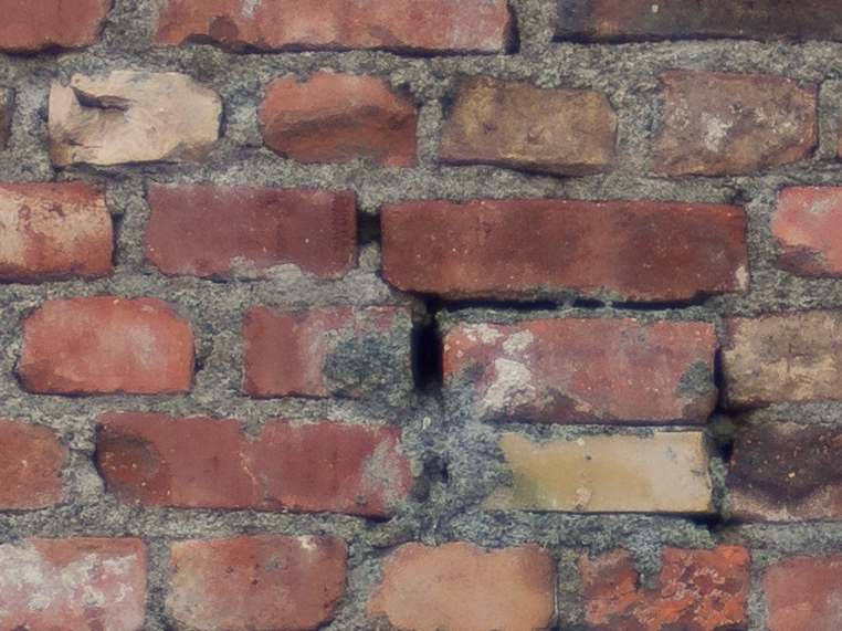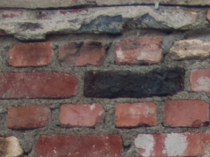 Als ersten Test habe ich mir nach bewährtem Vorbild eine Backsteinmauer ausgesucht. Von links nach rechts Totale, Crop aus der Mitte und Crop aus der Ecke bei f 2,0