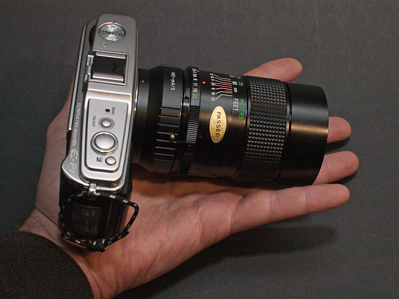 Der große Vorteil ist hier natürlich wieder das 4/3-Format, das über den Crop-Faktor 2 kompakte Objektive zu virtuellen Tele-Riesen aufpumpt. Konkret habe ich hier das Vivitar 2,8/135 für Minolta MD unter die Lupe genommen bzw. an meine kleine Zweitkamera, die Olympus E-P1 geschraubt (an die E-3 lässt es sich zwar ebenso leicht per Adapter hängen aber da stimmen dann einfach die Proportionen nicht). Eine ganz kurze Vorstellung hatte es schon mal irgendwo im Forum gegeben, aber ich mache trotzdem einen neuen Thread auf, da dort auch andere Objektive besprochen wurden.