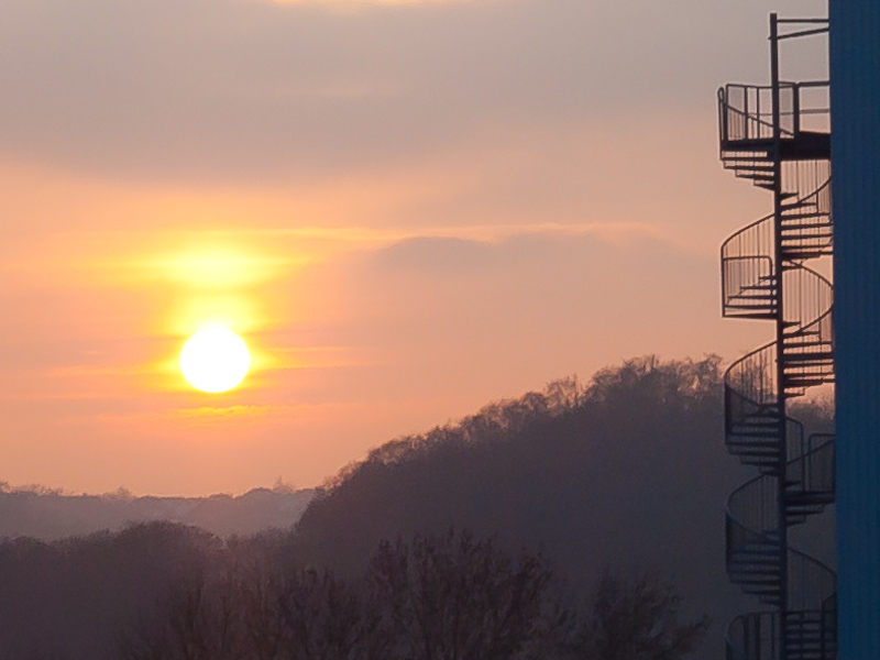 Dass die Scharfstellung auf unendlich ebenfalls klappt und auch Gegenlichtsituationen zu keinen Problemen mit Blendenflecken, Flares o.ä. führen, zeigt der Sonnenuntergang (Blende 8). Nur eine kleine rötliche Reflexion vom Sensor sieht man links am Dachgiebel aber dafür kann das Objektiv relativ wenig, das scheint mir ein generelles Problem der E-P1 zu sein, das man bei fast allen Optiken beobachten kann: