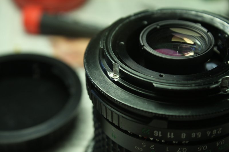 Anschließend funktionieren sowohl Blende wie auch Fokus. Das monentan benutzte EF-Bajonett gehört natürlich noch zum Rokkor 24mm, aber der nächste M42-EOS Adapter liegt als Rohmaterial schon bereit.