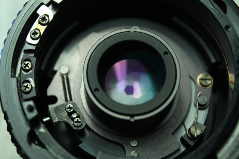 Das Objektiv besitzt vorne zwei Löcher im Ring zum Zugang zur Frontlinse, doch der interessante Teil der Mechanik ist ja hinten im Objektiv, also habe ich dort begonnen.