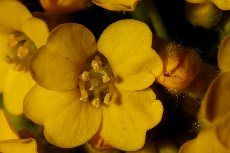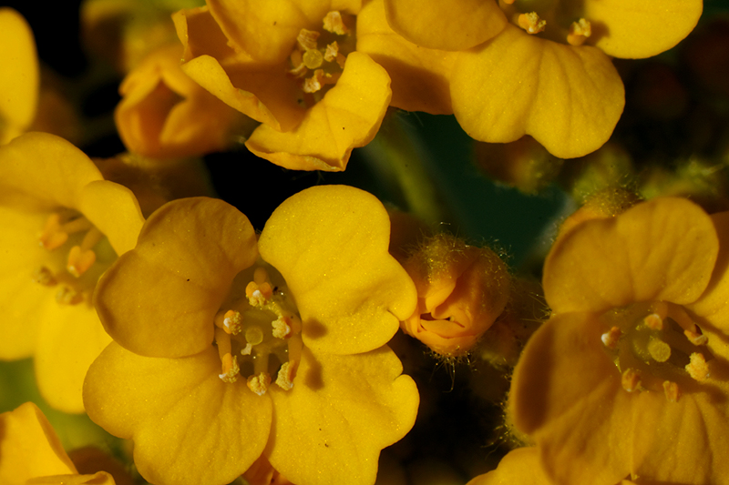 Heute habe ich bei wenig Wind gelbe Büten (Durchmesser ca. 5 mm) fotografiert. Wiederum bei mittlerem Balgenauszug. Die LiveView Fokussierung erwies sich als schwierig, weil der geringste Windhauch die Blüten auf dem Monitor zappeln ließen.