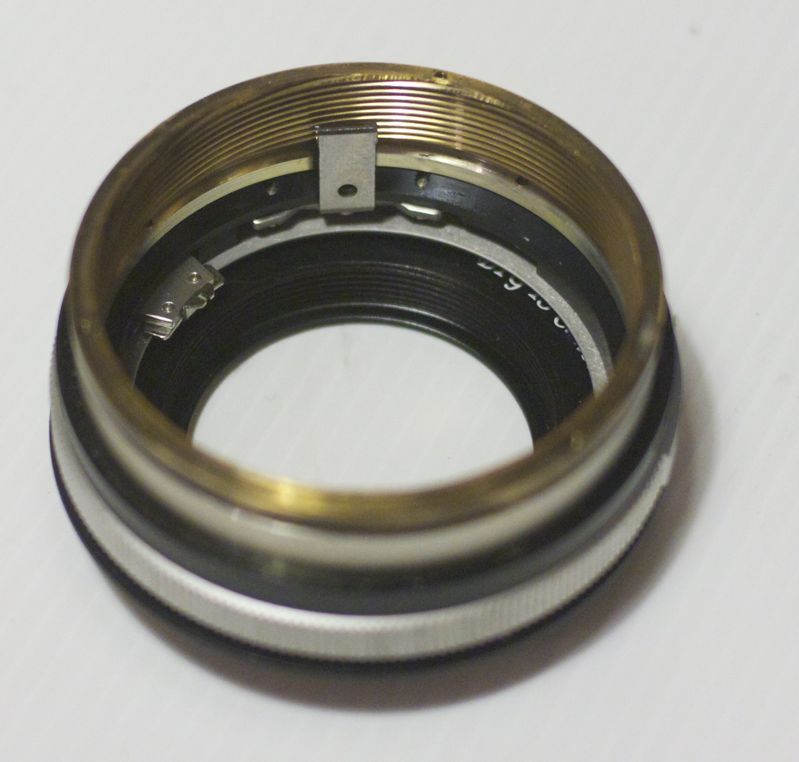 Beim Zusammenbau hatte ich ein kleines Problem. Der Messingfarbene Ring hat ein inneres und ein aeusseres Gewinde. Das auessere ist mit dem Fokusring verbunden, im Inneren befindet sich ein weiterer Ring, der mit der Optik verbunden ist. Das ganze System scheint eine Art Getriebe zu bilden, das die geringe Ganghoehe des Fokusgwindes auf die steileren Ganghoehe der Optikhalterung uebertraegt. Beim Wieder-zusammensetzen habe ich mir den Muehsam durch Abschleifen erarbeiteten Undendlichpunkt verstellt. Und zwar gruendlich. Ich kann jetzt so weit ueber Unendlich hinaus fokussieren, dass ich mir das Schleifen des Objektivs wie in der cogitech-Anleitung vermutlich haette sparen koennen. Mir ist nur nicht ganz klar, was ich beim Zusammenbau falsch gemacht habe ? Aus anderen Anleitungen habe ich in Erinnerung, dass man den Helicoid manchmal um 90 oder 180 Grad versetzt einbaut um auf Undendlich zu kommen. Vielleicht habe ich ja sowas gemacht ?