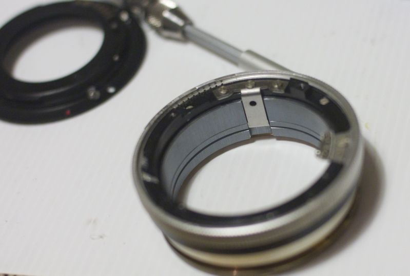 Beim Auseinanderbauen fand ich uebrigens ein kleines Kuegelchen, das beim Umbau auf EF-Mount in die Linse reingefallen war (und nachdem ich vergeblich auf dem Kuechenboden herumgekrabbelt bin) - das haette auch leicht einen Gewindeschaden am Helicoid verursachen koennen. Glueck gehabt.