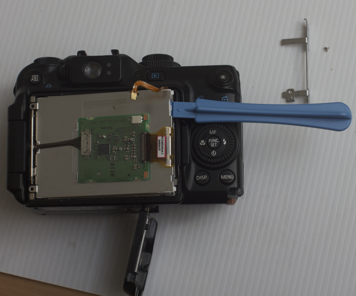 Anbei ein paar Bilder vom Auswechseln des Displays einer kaputten Powershot G11, die jemand auf dem Autodach vergessen hatte und losgefahren ist. Das Ersatzteil bekommt man auf ebay aus Hongkong fuer $38 incl. Versand, einem Schraubenzieher und einem Plastikwerkzeug zum Aushebeln des alten Displays. Viel dazu gibt es nicht zu sagen, wenn man sich traut so eine Kamera aufzuschrauben gestaltet sich der Umbau recht einfach. Der schmale Folienstecker ist fuer die Hintergrundbeleuchtung, der breite fuer das Display. Fuer den breiten Folienstecker gibt es eine Klappe zum Anpressen der Kontakte und zum Verrriegeln.