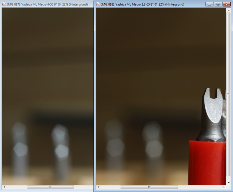In der zweiten (komplett schwarzen) Variante sieht das Yashica ML Macro 4/55mm dem Nachfolger 2,8/55mm zum Verwechseln ähnlich, so dass eine Unterscheidung rein äußerlich fast nur anhand der Beschriftung möglich ist. Auffällig am ML Macro 4/55mm ist die Blende, die als einziges mir bekanntes Yashica ML Objektiv nur 5 Blendenlamellen besitzt, was abgeblendet in den Highlights deutlich wird. Hier liegt neben der kleineren Anfangsöffnung auch der Hauptunterschied im Vergleich zum 2,8/55mm. Beide Objektive liefern trotz unterschiedlicher Linsenkonstruktionen am Crop (Canon EOS 50D) derart ähnliche Ergebnisse, daß eine Zuordnung oft nur anhand der Highlights vorgenommen werden kann. Lediglich im direkten Vergleich wirken die Bilder des 4/55mm etwas kühler, auch scheint mir die Brennweite des 4/55mm minimal länger. Beides ist in der Praxis allerdings nicht wirklich relevant.