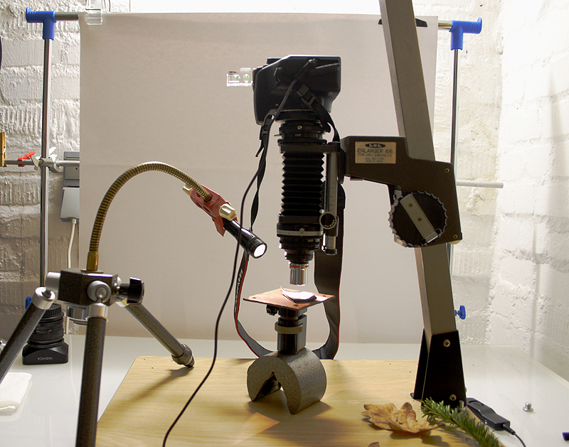 Links die Taschenlampe am beweglichen Schwanenhals. Die Kamera mit Balgen und Objektiv ist an einem alten Stativ eines Vergrößerungsgerätes montiert.