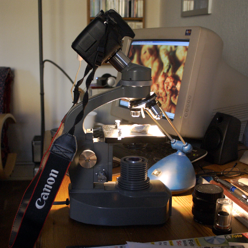 Nach dem Spielen mit allerlei Präparaten, die ich hier noch aus Schulzeiten rumliegen hatte, wollte ich eine Kamera adaptieren.