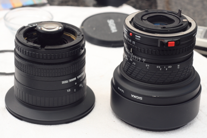 Links das bereits vom Sigma-FD Mount befreite Zoom, rechts das noch umzubauende 14mm "über Kopf"...