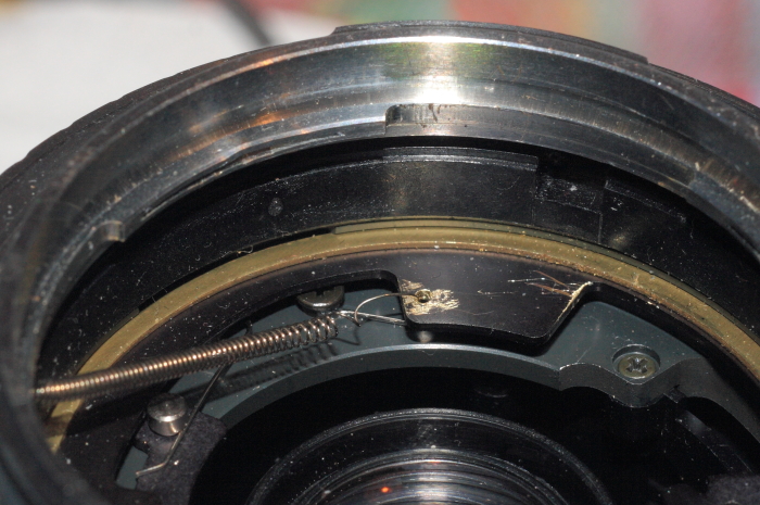 Dann geht es an die Arbeit.. im nachfolgenden Bild stelle ich die Blendenfunktion wieder her.. dazu wird der eingangs erwähnte Mitnehmer umgedreht wieder am Blendenring verschraubt.. gut erkennt man die kleine nach oben ragende, "zerkratzte Nase" neben diesem Hebel.. Diese "Nase" musste lediglich nach oben gebogen werden und ist nun mit dem Mitnehmer so gekoppelt, das die Blende aufgeregelt wird bei Drehung des Blendenringes.. tja, nur so bleibt sie offen..