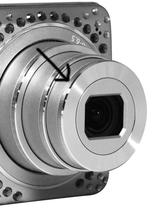 du meinst, da ist ein Schutzglas vor der ersten Objektivlinse ? bei den meisten Digiknipsen kann man den vordersten Teil abmachen (siehe pfeil): drehen oder abhebeln, dann müsste man weiter an das Problem herankommen. wie das genau bei dem Modell geht, weiss ich allerdings nicht