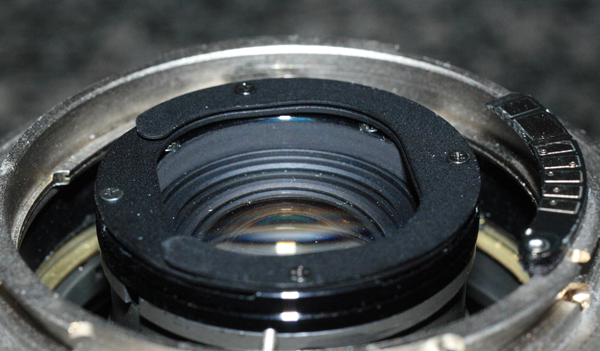 Dieses Objektiv besitzt an seiner Rücklinsenfassung eine Halterung für Steckfilter, weil man an diesem Objektivtyp durch die immense Frontlinse und deren Kugelform keine Filter anbringen kann.