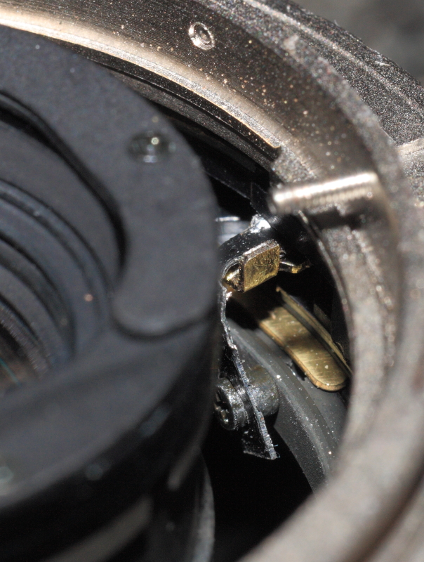 Hier sieht man am kupferfarbenen Blendenringhebel, die zusätzliche Lasche, die nach unten an den Pin des Blendenmitnehmer-Ringes geht. Dieser ist durchgesteckt durch das eigens gefertigte Loch in der Lasche. Die Lasche selbst wurde mittels einer Lötverbindung mit dem Blendenringhebel (Kupfer).. verbunden..