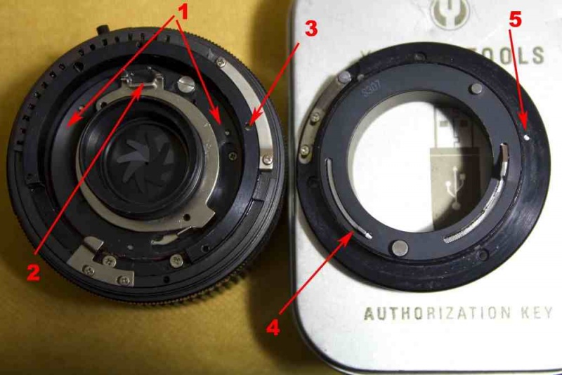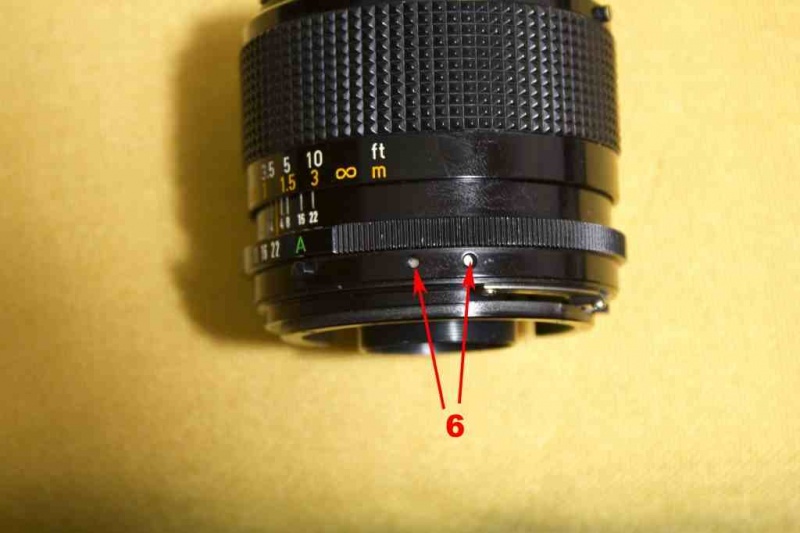 Zunächst einmal benennen wir mal die Teile.. # 4 ist der Übertragungshebel, welcher dem Belichtungsmesser der Kamera den eingestellten Blendenwert mitteilt.