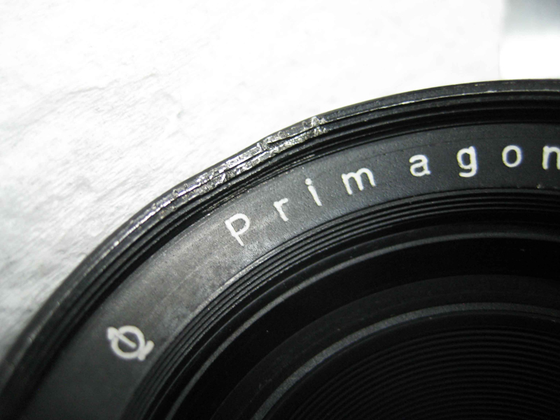 Ich hoffe, dass ich hier richtig bin. Ich brauche einen Tip. Ich habe mein Primagon zerlegt, weil die Entfernungseinstellung zu schwergängig ist. Diese Teile, kameraseitig, konnte ich auch ohne größere Probleme ausbauen. Die Filterseite ist für mich ein Problem, da das Gewinde (durch einen Vorbesitzer) zerdrückt ist. Eine Geli hält gerade noch so. Wenn ich vom Filter nach Frontlinsendemontage in den Kegel schaue, ist ein Ring mit zwei Nuten sichtbar. Er hält die zweitvorderste Linse. Den Ring kann ich etwas herausdrehen. Dann ist Schluss, weil er gegen einen Absatz drückt. (Sieht jedenfalls so aus). Ich vermute, dass der Ring mit der Beschriftung "Primagon etc." herausgedreht werden muss. Wenn das so ist, stört das verdrückte Gewinde.