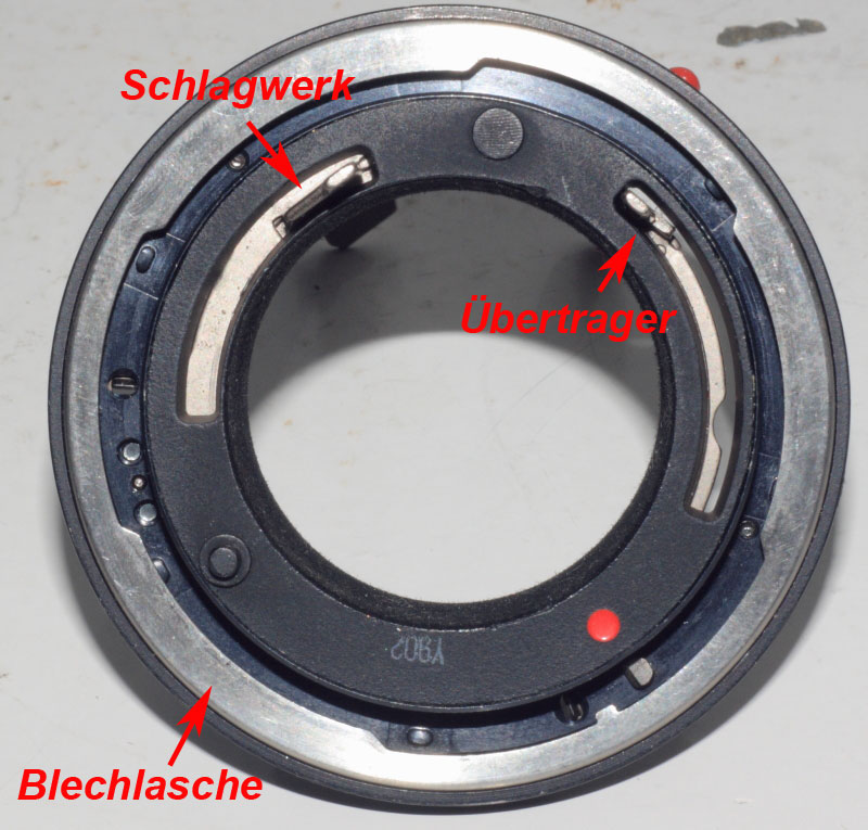 Im Bild ist zu erkennen, das sich unter dem Chromring in der Nähe der roten Ansetzmarkierung eine Blechlasche befindet, die verhindert das der Chromring sich wie beim Ansetzen und Verriegeln des Objektivs an die Kamera drehen lässt.