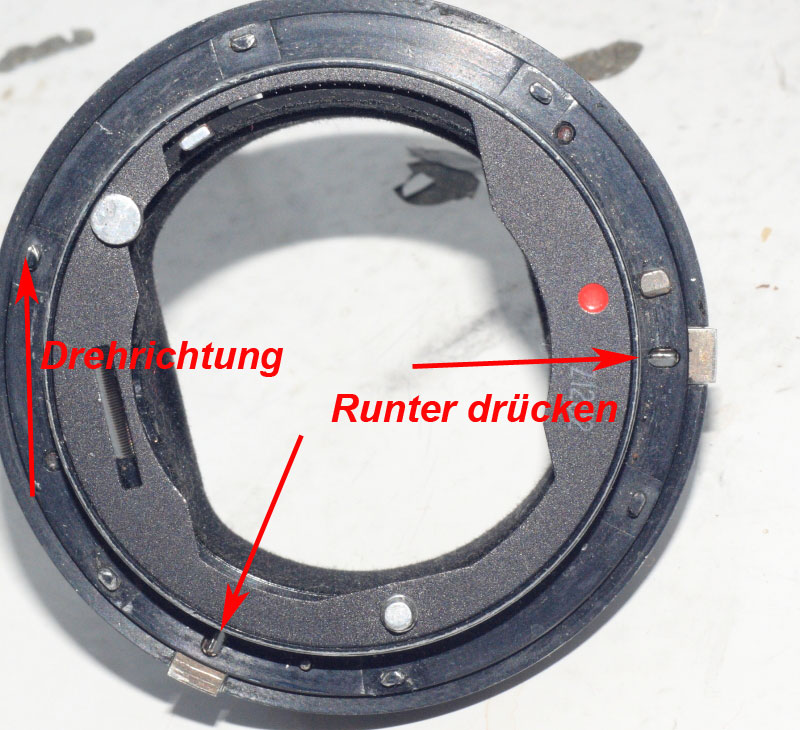Also den PIN mit einem spitzen Gegenstand runterdrücken und den Chromring drehen, dann sollte alles klarer werden und die drei Pfeile zeigen, wie sich der Blendenübertragungshebel jetzt mit der Blenden einstellung mitdreht.
