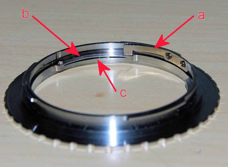 Die mit b und c markierten Spreizen sind schuld am wackligen Sitz, bitte mit spitzem Gegenstand auseinanderdrücken, dann hält das Objektiv sicher im Aufnahmebajonett..