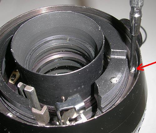 die drei Schrauben entfernen und den Teil nach oben abziehen. Blendenring ebenfalls nach oben abziehen