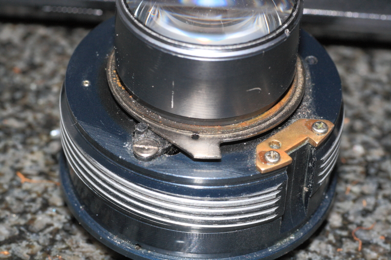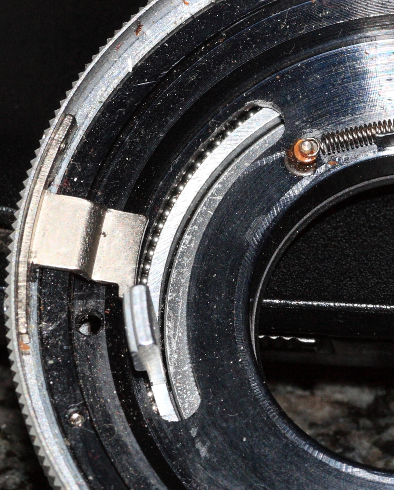Bei Deinem Objektiv wurde dann vom Vorbesitzer schlicht vergessen, den Blendenübertragungshebel zum Belichtungsmesser beim Wiederzusammenbei und dem erneuten festschrauben der Nase, eben den Blendenübertragungshebel zum Belichtungsmesser vor der Befestigung mit den beiden Schrauben korrekt auszurichten.. also hoch zu ziehn. So landete die Nase unterhalb statt oberhalb des Hebels..