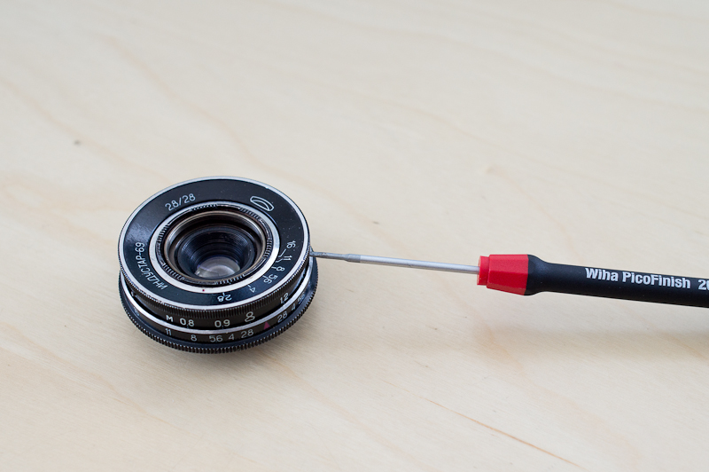 Mit dem Schraubendreher öffnet man die drei Madenschrauben, die das Oberteil mit der Entfernungsskala halten. Dabei müssen die Schrauben nicht komplett entfernt werden, sondern nur soweit, bis sich das Oberteil nach oben abnehmen lässt.