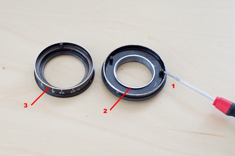 Lässt sich der Fokus auf Unendlich einstellen, kann man die Gewinde neu fetten und das Oberteil wieder mit den drei Madenschrauben auf dem Linsenelement befestigen. Doch STOP leider sind wir noch nicht ganz fertig. Schraubt man das Objektiv an die Kamera, so wird man in der Regel feststellen, dass es sich immer noch nicht auf Unendlich stellen lässt. Doch wo liegt der Fehler? Das Problem ist, dass das Oberteil (3) noch zu dick ist und am Unterteil anschlägt, bevor die Linsengruppe nahe genug am Sensor ist. Also das ganze noch nicht zusammenbauen und das Oberteil ab auf den Bandschleifer. Das Oberteil (3) muss um rund 1mm abgeschliffen werden. Auch hier gilt besser Schritt für Schritt arbeiten und dazwischen wieder testen. Wer keinen Bandschleifer hat, kann hier auch mit gewöhnlichen Schleifpapier oder dem Dremel zu Werke gehen.