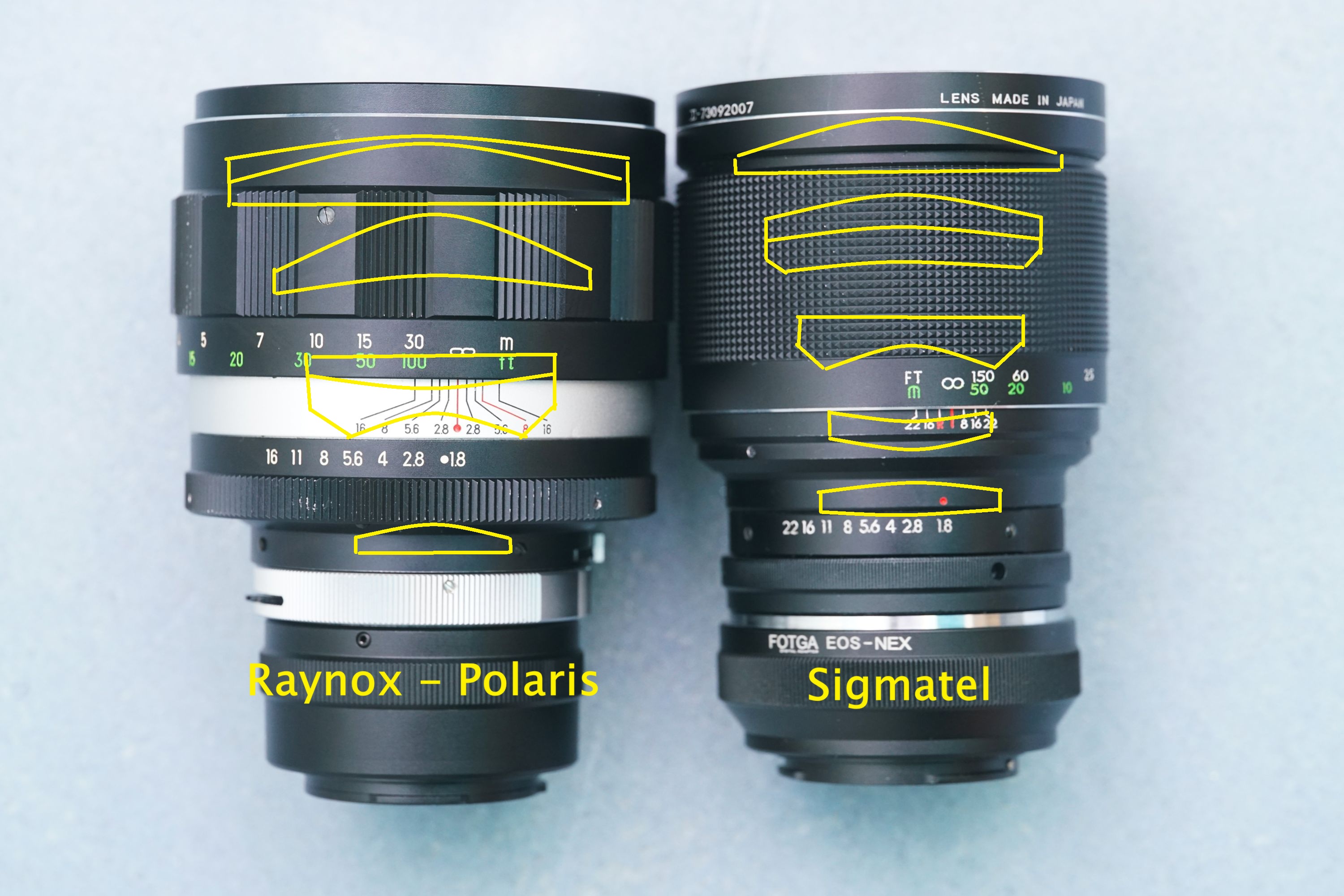 des Spiratone Objektives oben links, also nicht die Pluracoat Version). Es sind beides 6-Linser. Das Raynox/Polaris