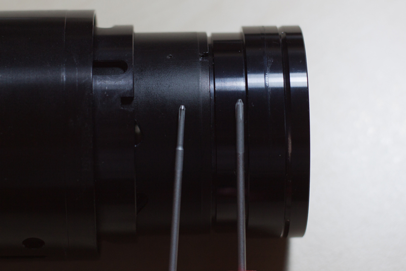 Schrauben sind keine zu sehen, bzw. alle sichtbaren herausgeschraubt. Ich habe mit großer Kraft versucht, beide Teile gegeneinander zu drehen. Es geht nicht. Kann es sein, dass die Teile miteinander verklebt sind? Bei diesem Objektiv habe ich an vielen Stellen Versiegelungen/Klebstoff gesehen. Im Bild rechts neben den Schraubendrehern ist auch das Material zu sehen. Ich habe bisher kein Mittel zum Lösen gefunden (Benzin, Isoprop, Terpentin). Nur beim Kratzen platzt das spröde Material ab. In den Backofen habe ich die Teile noch nicht gelegt.