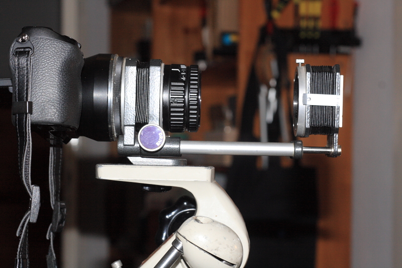 Mit einem 50er EL NIKKOR N oder einem APO Rodagon N 2.8/50mm ergibt sich eben auch am Balgen in dieser gleich gezeigten Konstellation ein Vollbild 1:1 auf dem Sensor, wenn diese besagten 10 cm ab Objektivvorderkante eingehalten werden.