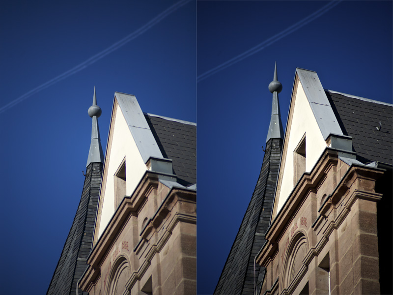 Hier habe ich zwei Schüsse nach oben gerichtet, um sehen zu können, ob ich mit jeweils einem Bild den gewünschten Fokus treffen kann. Beide Bilder Offenblende am Tele-Ende. Die Randabschattung ist gut erkennbar. Auch eine gewisse Weichheit ist vorhanden - knackig bei Offenblende sieht anders aus, hier müsste man nachkorrigieren oder - klüger - abblenden.