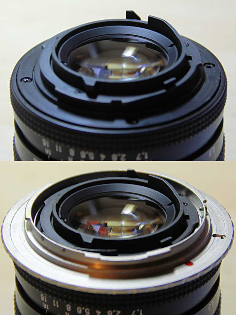 Hier das Planar 1,7/50mm von hinten. oben ohne, unten mit C/Y-EOS-Adapter: