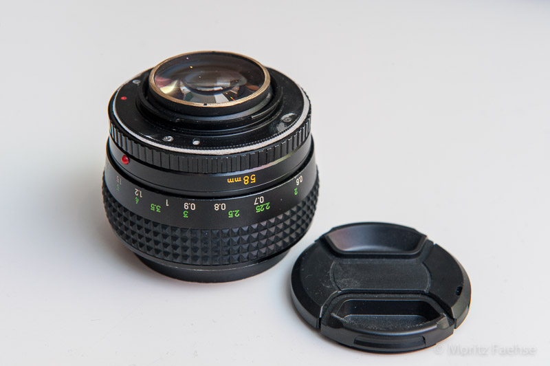 Insgesamt bin ich mit dem Umbau jetzt schon sehr zufrieden. Das Objektiv habe ich gebraucht völlig unbrauchbar (mit toten Insekten zwischen den Linsen und völlig verölter Blende) günstig erworben, dies ist alles schon wieder 1A :clapping Die Linsen sind übrigens perfekt, das sieht auf dem Foto etwas komisch aus. Hinten musste ich die Fassung der Rücklinse etwas kürzen, damit der Spiegel nicht anschlägt. Jetzt fehlt wohl nur noch der Abschluss..