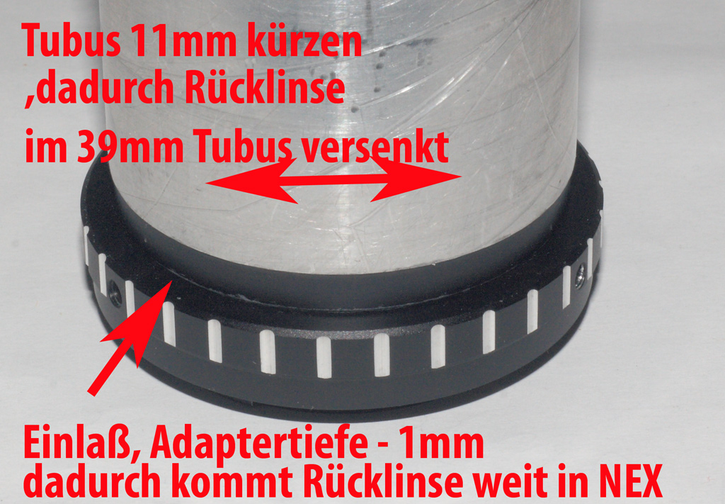 Der Tubus des Meostigmat 1/50mm gestattet es, ihn rund 11mm zu kürzen.. so tief ist der "Graben" zwischen Rücklinsenfassung und Tubuswand des Meostigmat.
