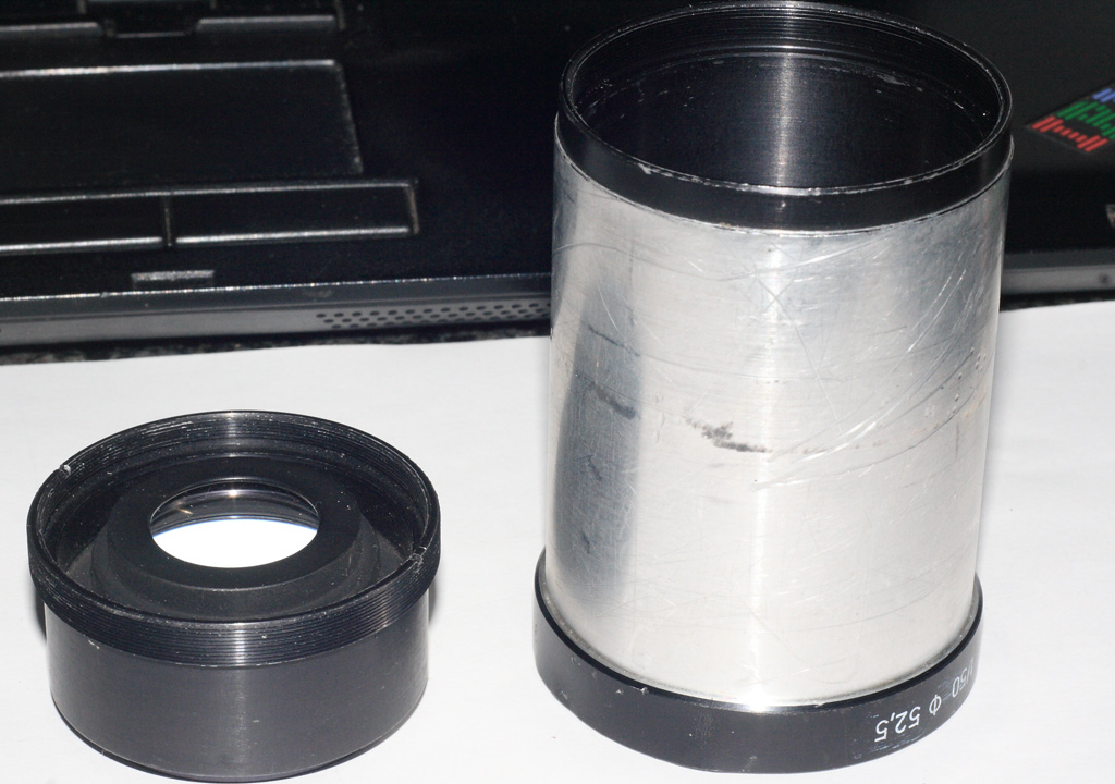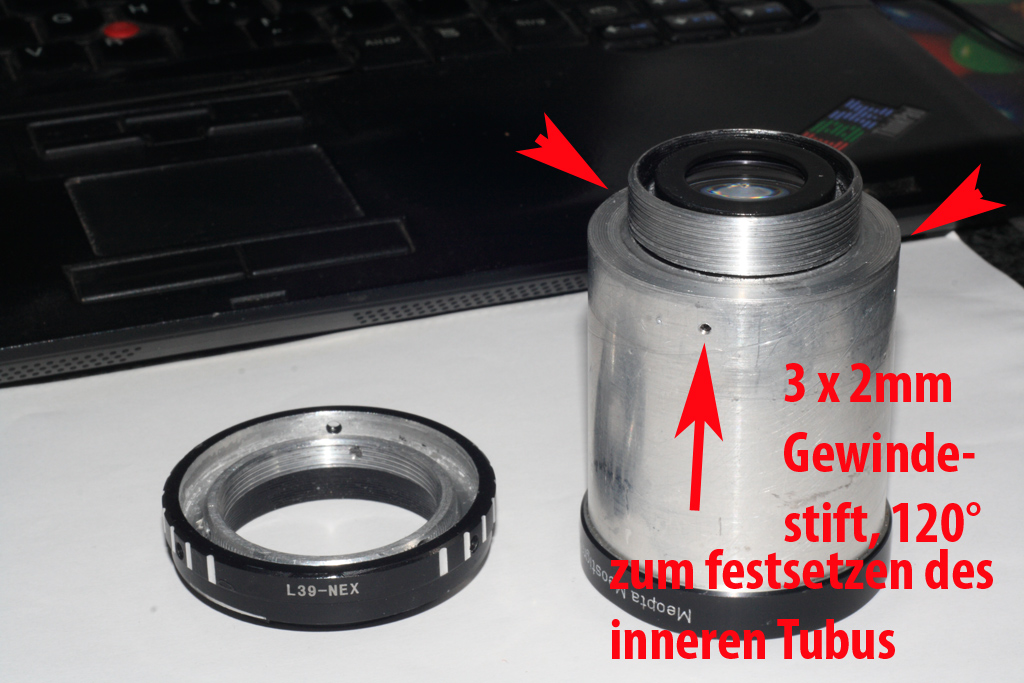 Ein kleines Problem ergibt sich noch am Rande.. das Meostigmat hat, wie auch der größere Bruder, eine komplett herausnehmbare hintere Linsenpackung, die mit einem Verschraubungsring nach hinten gesichert ist.. also ein eingesteckert Tubus im Meostigmat - Aussen-Tubus im Bild.