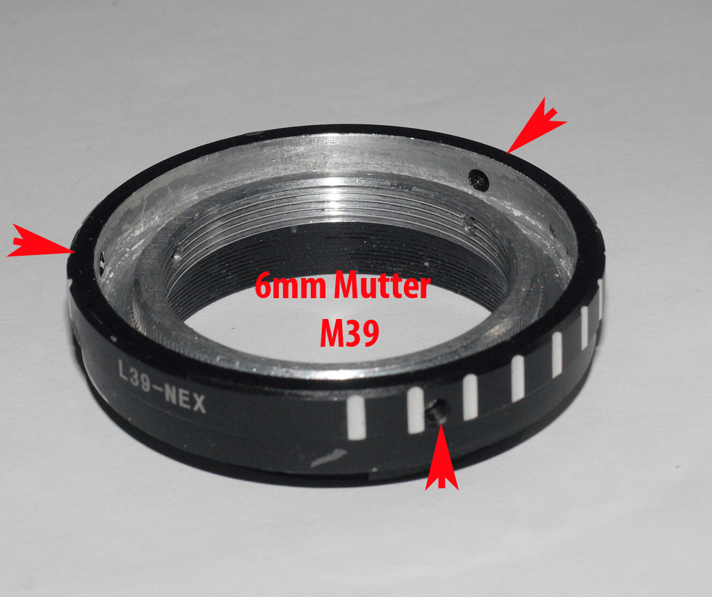 So haben wir nun ein M39 Gegen-Gewinde, welches das M39 Aussengewinde des 12mm Tubus, das nun am Objektiv angebracht ist, als Fokussiergewinde nutzen kann.