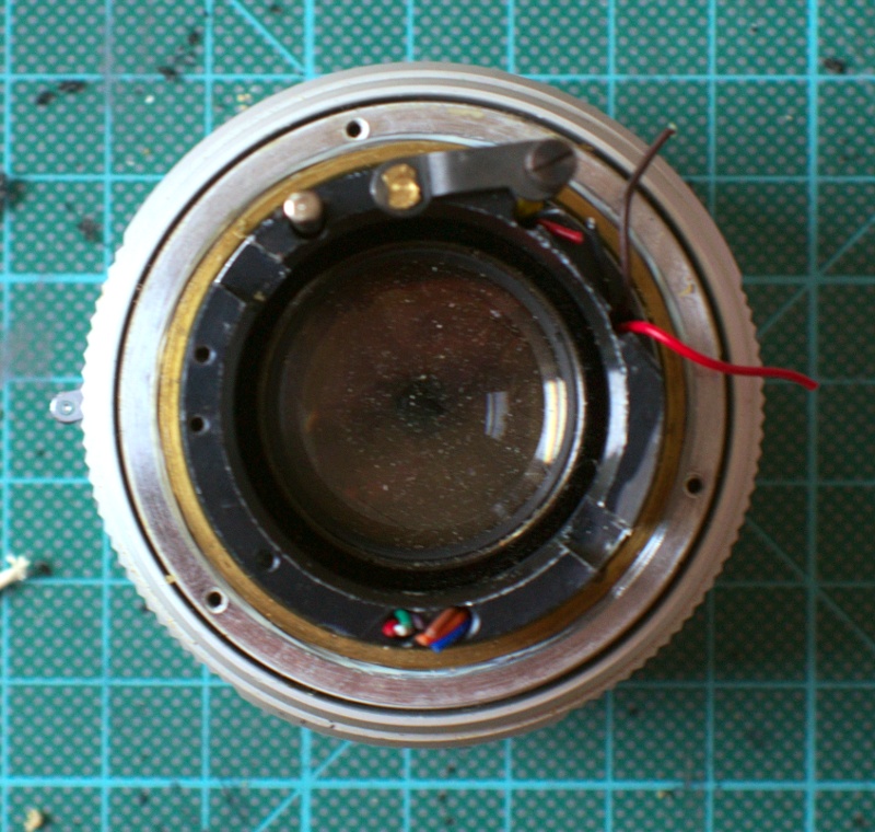 Das Objektiv lässt sich relativ einfach vom Body entfernen. Details/Fotos spare ich mir, das haben andere Menschen im Internet schon wunderbar dokumentiert. Ich habe einige Kabel entfernt, einige Schrauben und Stangen abgeschnitten und den Verschlussmechanismus entfernt. Am Ende hatte ich dann ein Objektiv mit einer auf der Kameraseite planen Fläche.