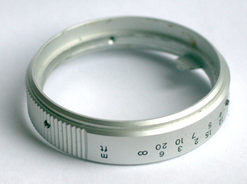 Die drei Schrauben im Inneren haben sich - möglicherweise durch ganz normale Benutzung - etwas gelockert. Irgendwann ist dann die erste Verschlusslamelle aus der Führung gerutscht und die Kamera war unbrauchbar. Der Besitzer hat dann einen Reparaturversuch gestartet und den Frontring mit irgendeinem groben Werkzeug traktiert. Dabei hat er beträchtliche Kraft aufgewendet und ist auch mehrfach abgerutscht wodurch aus den Kerben Riefen wurden. Dazu passt auch, dass sich der Blendenring nicht mehr so leicht drehen lässt, wie ich es erwartet hätte. Es fühlt sich etwas unrund an.