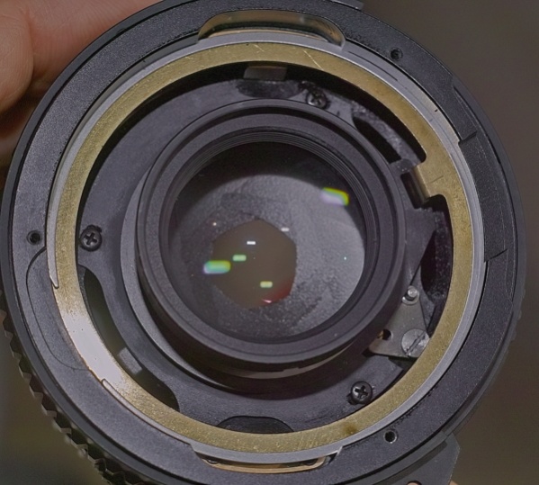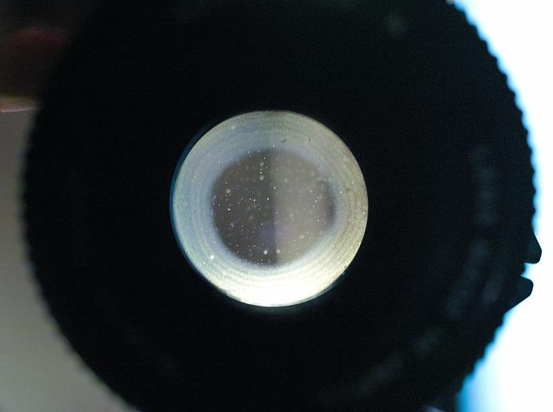 das vorgenannte Objektiv habe ich rel. günstig gekauft, mit dem Wissen daß die Blendenfunktion (Blendenlamellen einseitig verölt) zeitweise gestört sowie auch der Fokusgang hakelig und schwergängig ist .Diese Umstände konnten von mir leicht beseitigt werden. Mit einem selbst gefertigten Adapter konnte ich die Linse an meine Sigma-Kameras anschließen und einige Aufnahme-Tests durchführen. Die Aufnahmen mit Offenblende empfand ich etwas getrübt und der Blick von der Frontlinse durchs Objektiv zeigt auch den Grund der Trübung, denn auf der Linse hinter den Blendenlamellen ist eine schlimme Schmierade zu sehen. (Bild1)