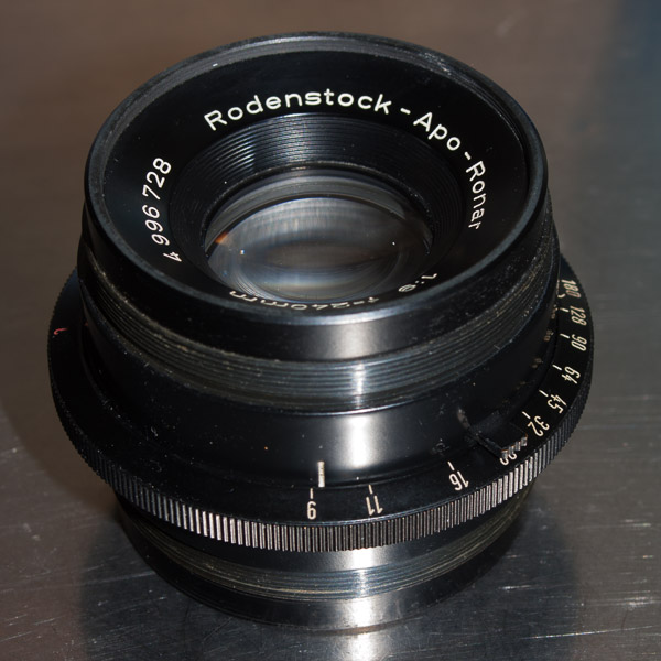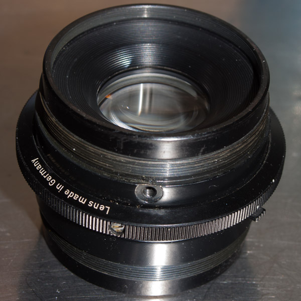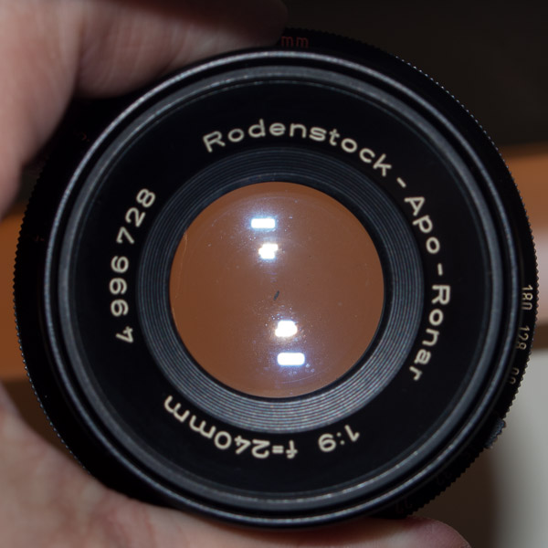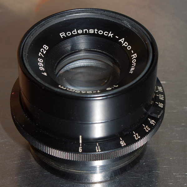 Meine Frage ist nun wie man dieses Objektiv zerlegen kann, Rodenstock war da etwas kreativer als Schneider die einfach zwei Objektivhälten in einen Blendenkörper geschraubt haben. Wie komme ich an die Linsen um sie zu reinigen? Das Objektiv sieht so aus: