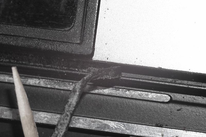 So können Lichtdichtungen aussehen, wenn sich ihr Schaumstoff im Laufe der Jahre vollständig zersetzt hat.. eine klebrige, den gesamten Kamerainnenraum verunreinigende "Pampe".. die wie Teer an den Stellen klebt, an denen sie ab Werk eingebracht wurden.